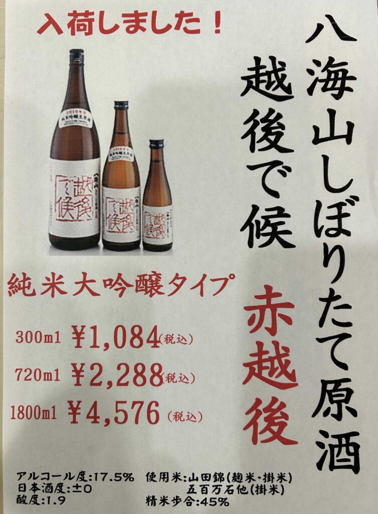 八海山 越後で候 赤越後 純米大吟醸 入荷しました。