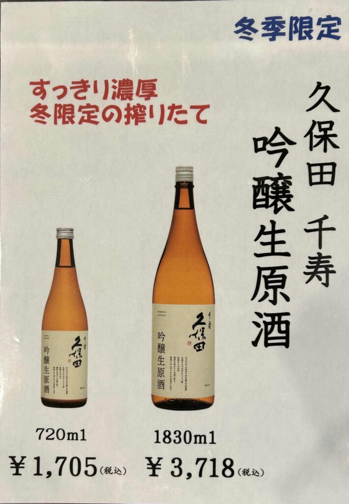 久保田 千寿 吟醸 生原酒 入荷しました。
